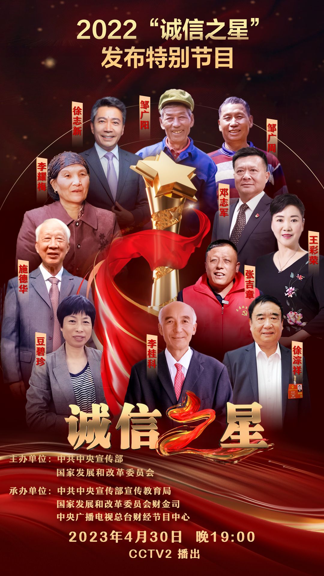 中央宣传部、国家发展改革委为这些“诚信之星”颁发了证书和奖杯。“诚信之星”发布特别节目将由中央广播电视总台财经频道于4月30日19时首播。